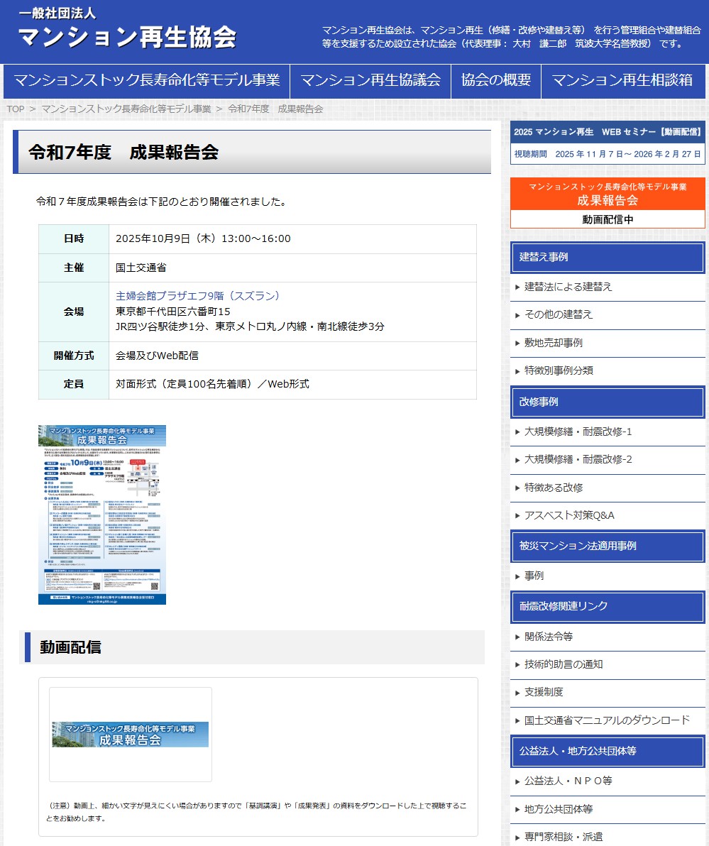 2025.10.09【国土交通省 マンションストック長寿命化等モデル事業】成果報告会で登壇しました。